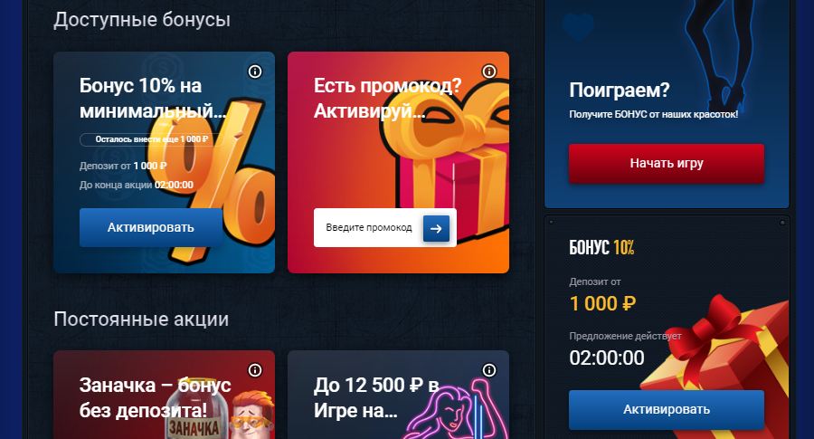 Бездепозитный бонус, все акции Вулкан казино