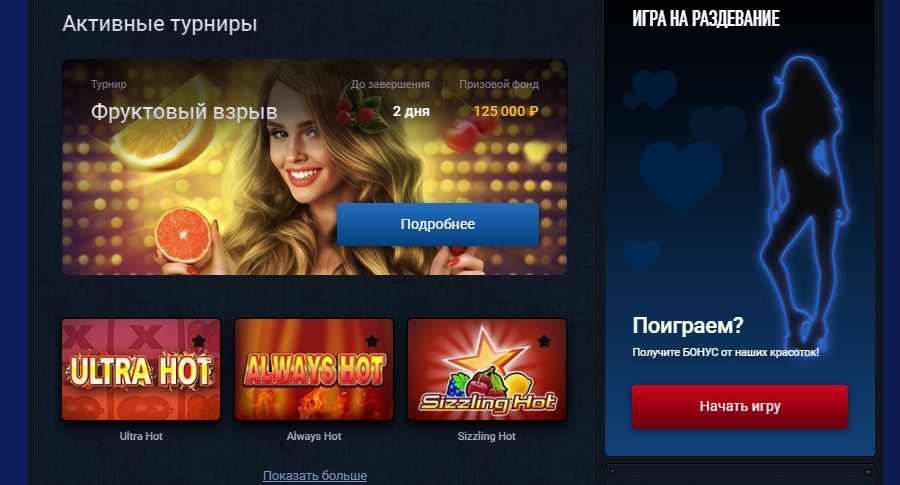 Казино Вулкан – популярный сайт с множеством игровых автоматов для игры на деньги, с регулярными турнирами и другими увлекательными играми, с выгодными бонусами, среди которых есть даже бездепозитный на 3000 рублей – его дают сразу при регистрации.